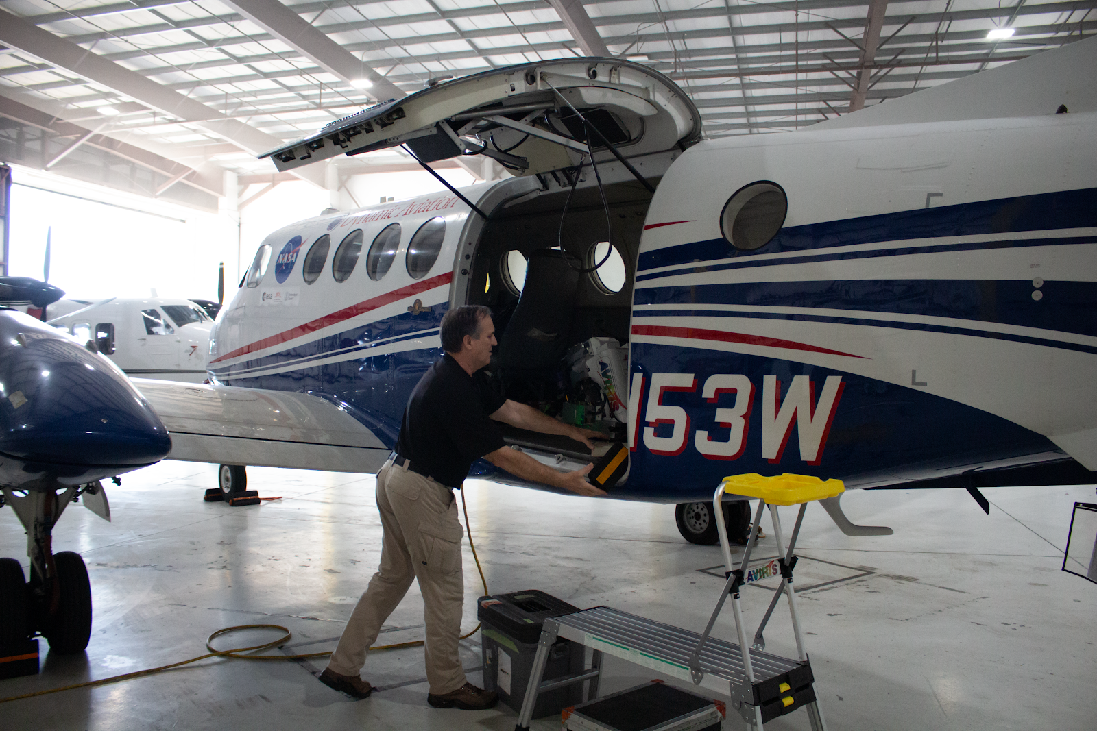 June 20, 2024 — Jet Propulsion Laboratory engineer Michael Eastwood prepares a greenhouse gas detector for flight.