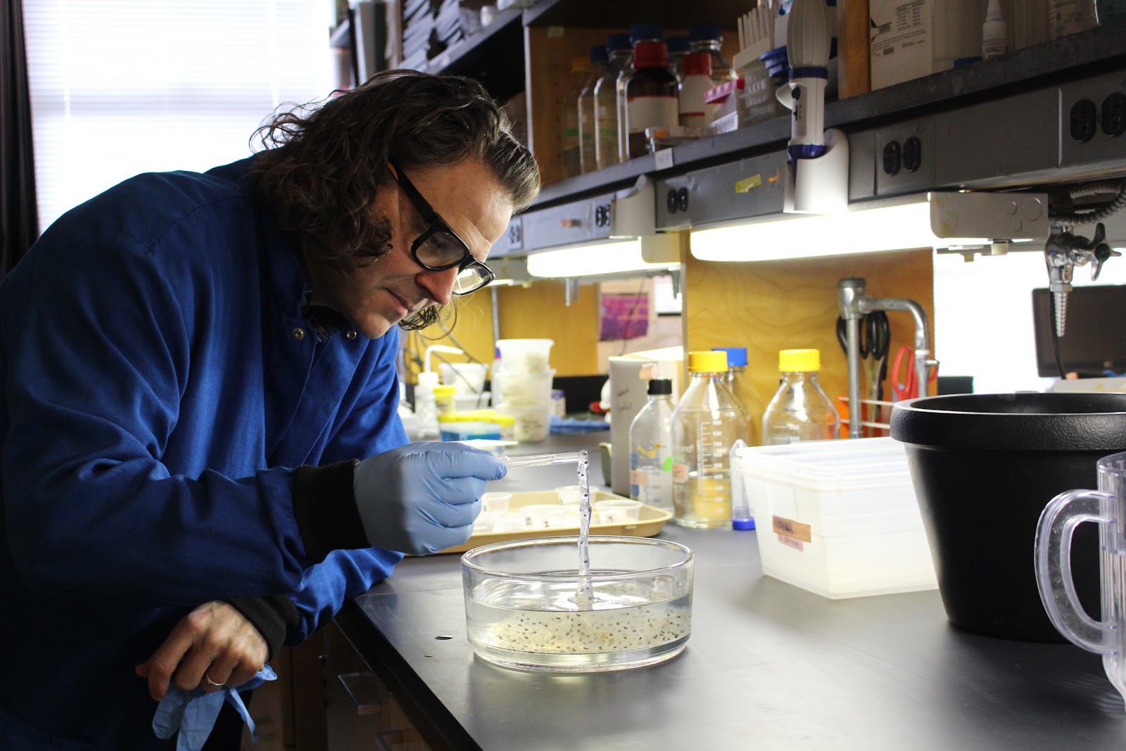 February 1, 2024 — Northeastern professor James Monaghan inspects axolotl eggs.